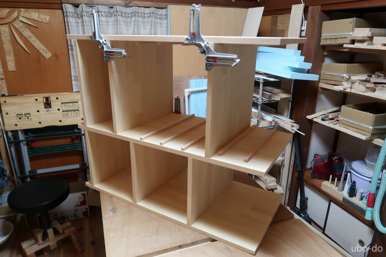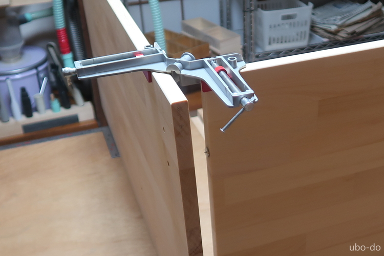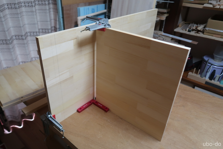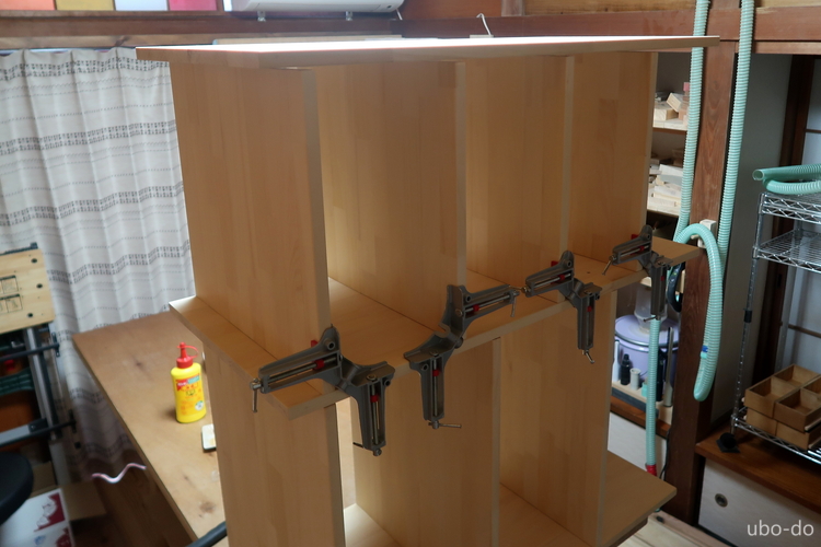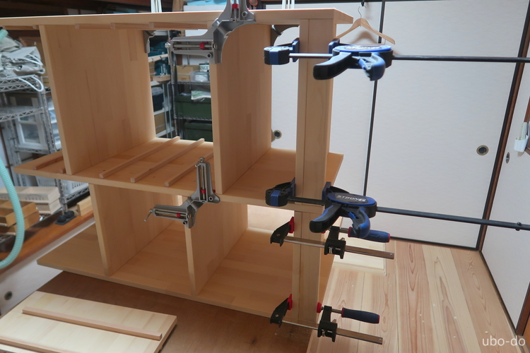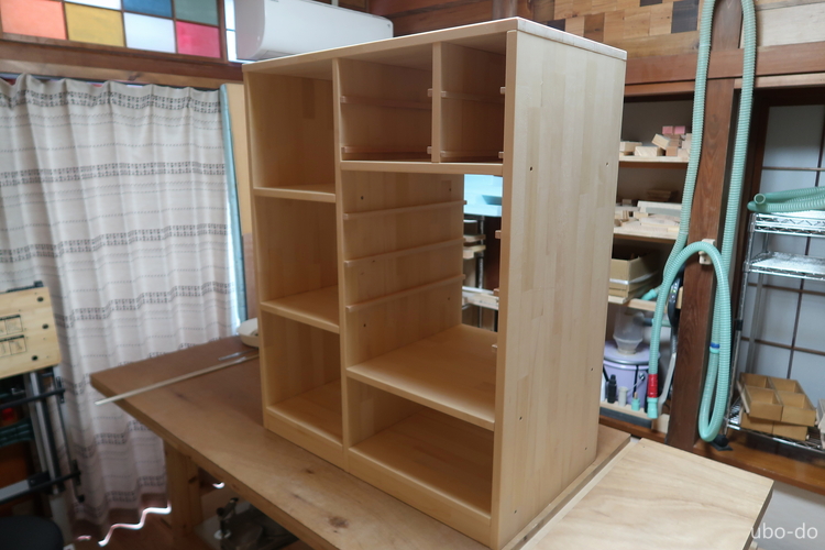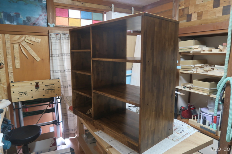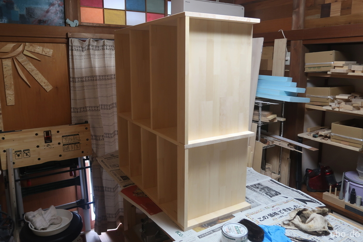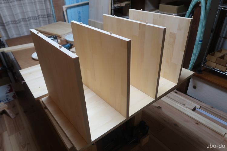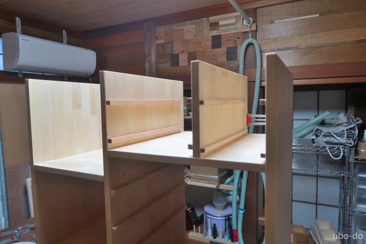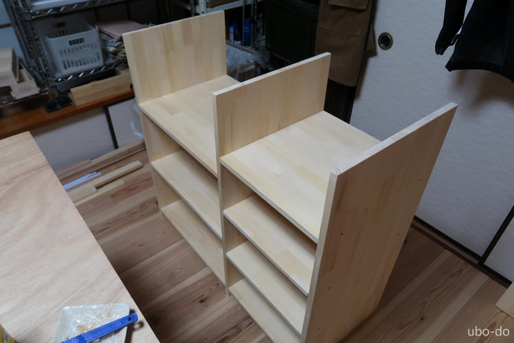右の棚は3段と4段の棚2列で、引出などは付けない。左の棚を作って手順は分かっていたので、さくさく作業が進んだ。