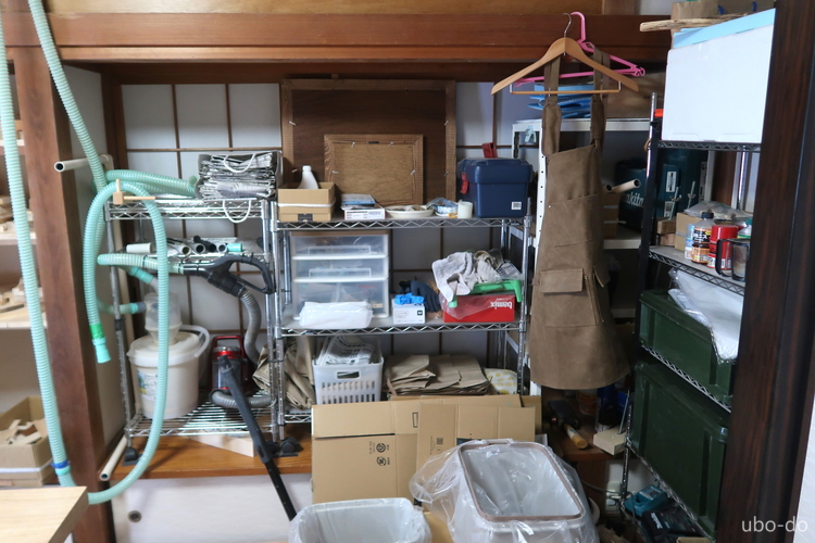 現状、障子窓は防音用の段ボールを詰めて閉めたままにしてあり、付書院と床の間部分にスチールラックを並べてDIYに必要なものを置いているが、今回はそこに作り付けのような棚を作ろうと考えた。