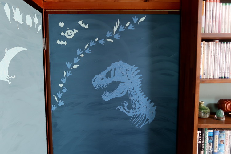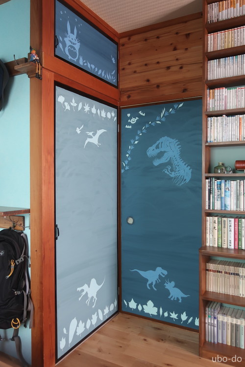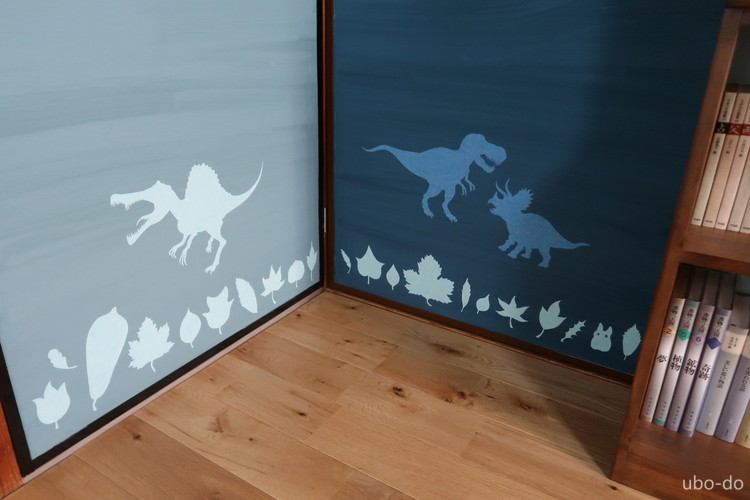 和室の時の名残である片引き戸とクローゼットの襖紙は洋室に会わないので、いずれ装飾しようと考えていたが、壁紙での切り絵を思いつくと同時に恐竜と木の葉のイメージが固まり、そこからは一気に進んだ。