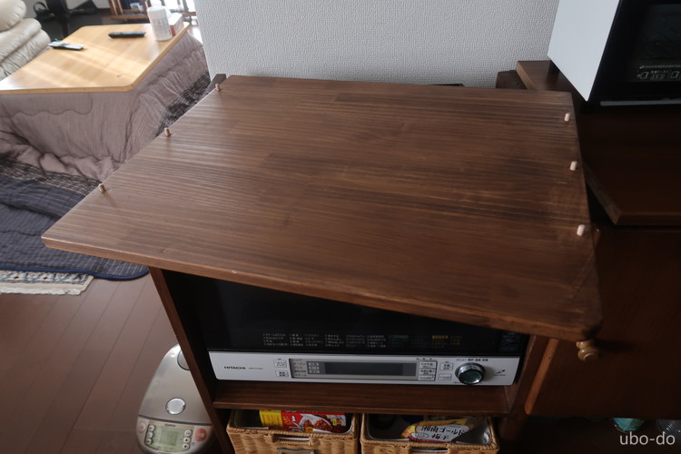しかしながら、天板を外すと上に置いてあるものをすべて移動せねばならない。それでは大変なので、オーブンレンジ上の天板だけ外せるように、天板を半分にカットすることにした。