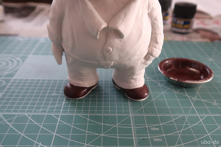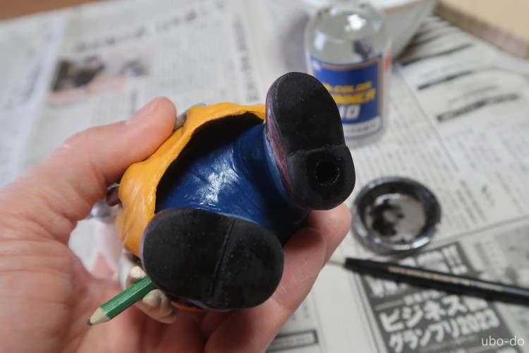 エプロンを付けるとズボンやシャツの一部が塗装できなくなるので、隠れて筆が届かなくなる部分を先に塗装することにした。塗装には模型用のアクリル塗料 (Mr.COLOR) を使用した。