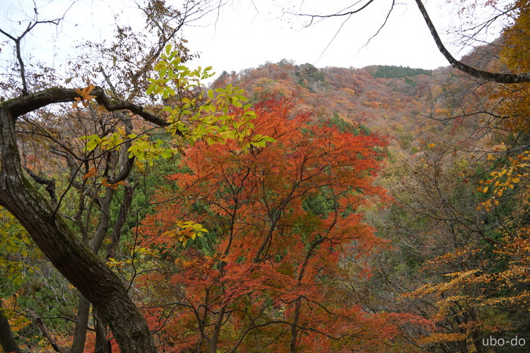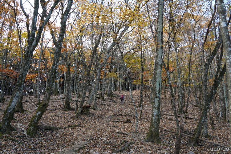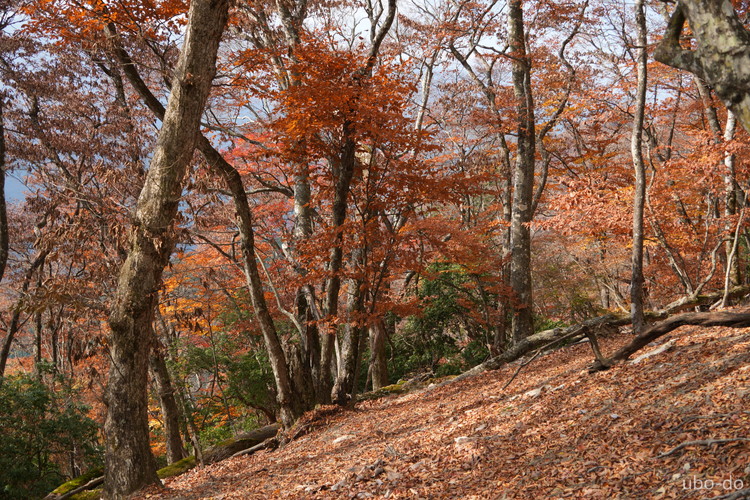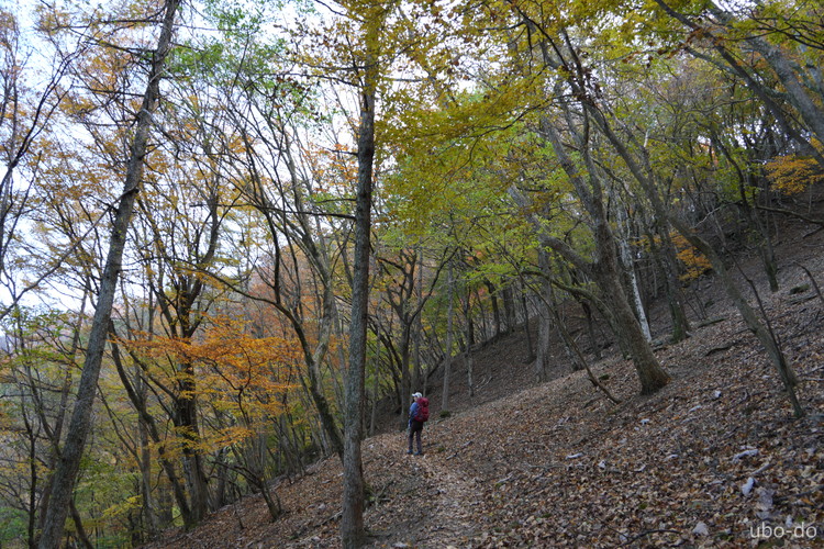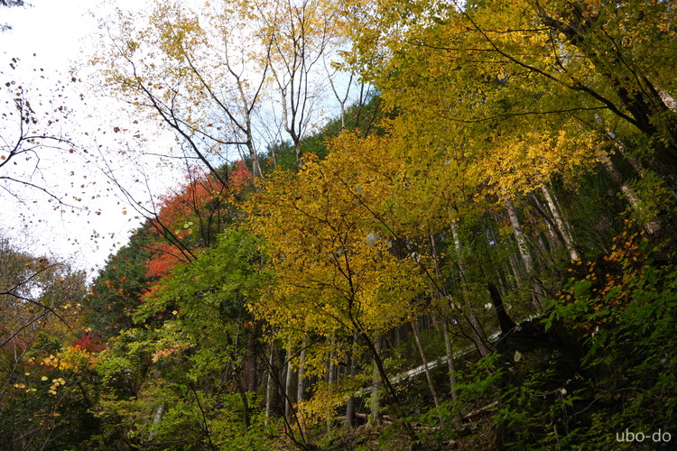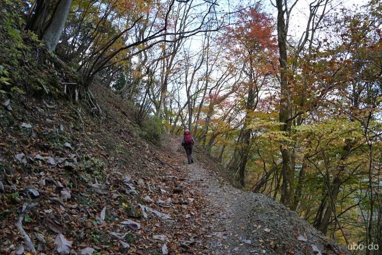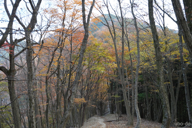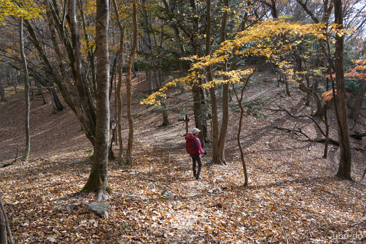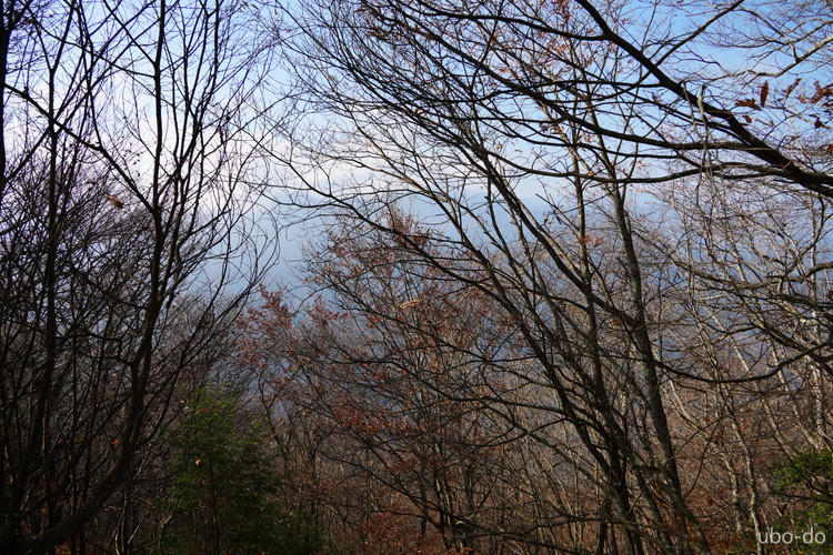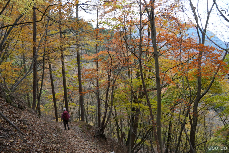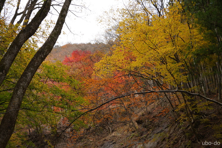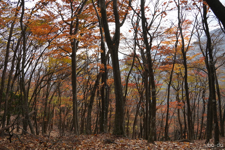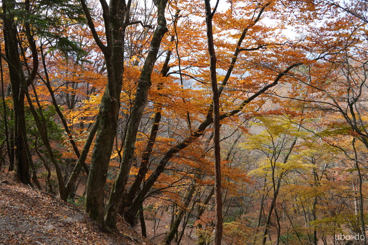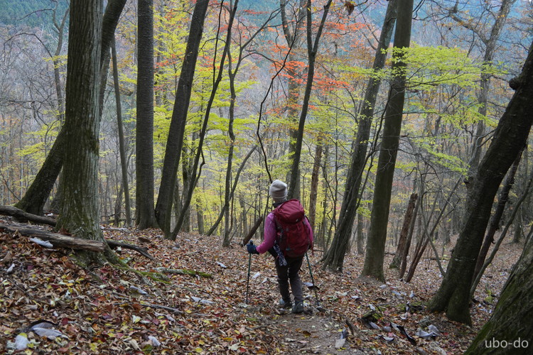 紅葉は終盤を迎えていたが、スポット的にはまだ綺麗な紅葉が残っていた。もっと日差しがあれば見栄えのする写真が撮れるのになぁ、と多少うらめしくも感じたが、久しぶりに静かな山歩きを楽しめた。